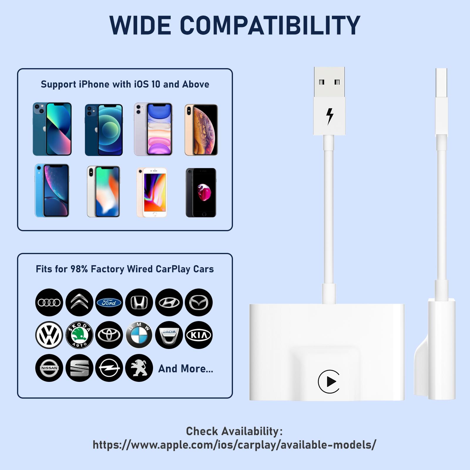 • Still struggling with which adapter to choose for your car? Our wireless CarPlay dongle can work with almost all car models WHICH HAVE FACTORY WIRED CarPlay (also works with most aftermarket versions), freeing you from model compatibility issues. Supported iPhone: iPhone 6 and above & iOS version 10 and above. You can also directly check the compatible models shown on the manual or contact us.