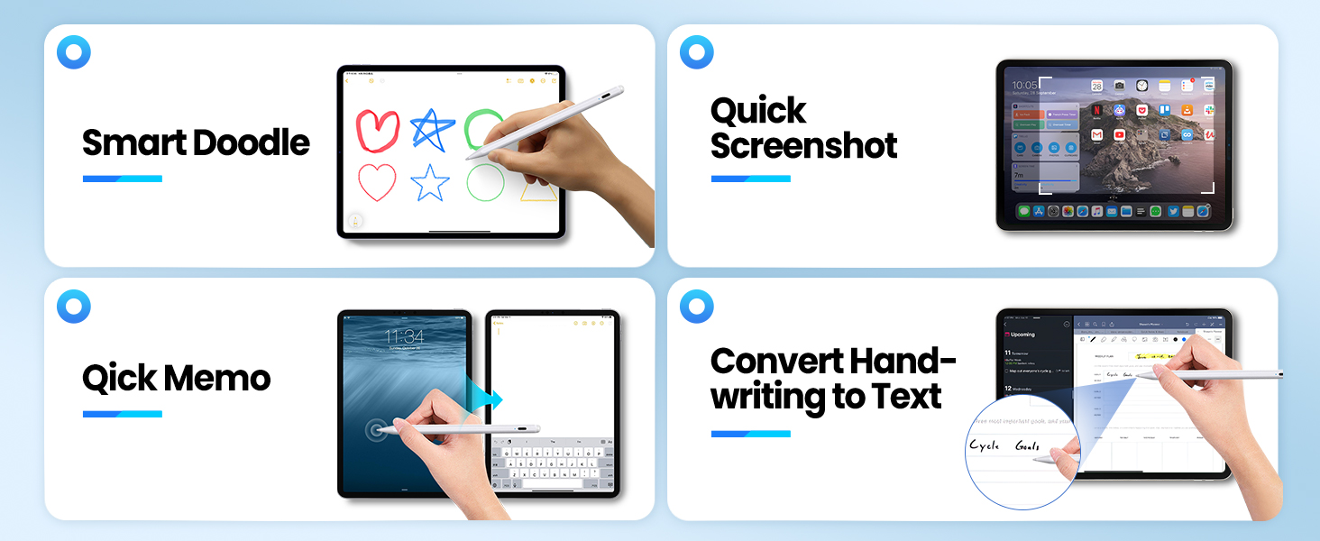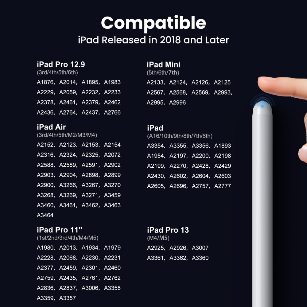 - Wide Compatibility: The iPad Pro pencil is specially designed for the 2018- 2026 iPad series, Compatible with the latest iPad models released in 2026: iPad Air 11”/13” (M4), iPad 11(A6). Also Compatible with iPad 10th/9th/8th/7th/6th Gen; iPad Pro 11”, iPad Pro 12.9″ 6th/5th/4th/3rd Gen,iPad Pro 13″ (M4/M5);iPad Air 5th/4th/3rd Gen, iPad Air 13″ & 11”(M2/M3); iPad Mini 7th/6th/5th Gen. Check compatibility in Settings > General > About > Model Name before you buy.