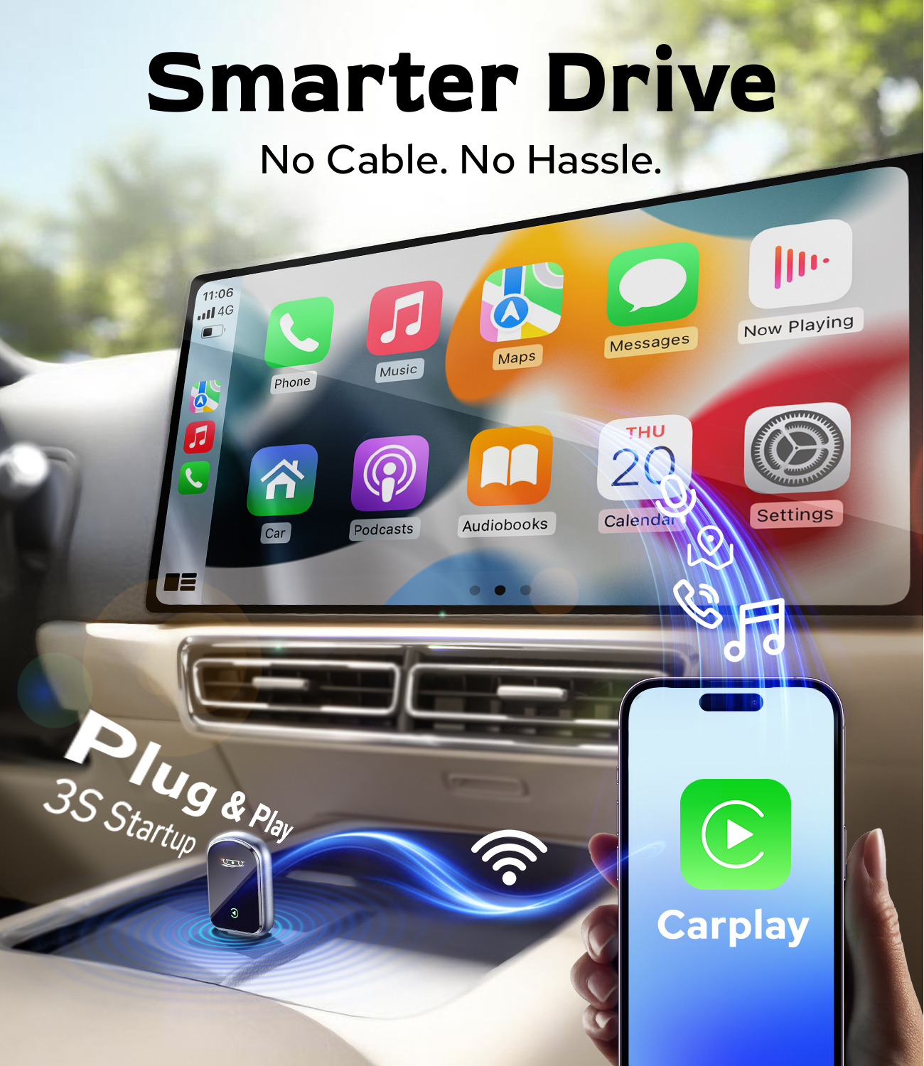 【Easy Setup & Automatic Reconnection】Setup is simple and fast—just plug in, pair, and play. After the initial pairing, your iPhone will automatically connect to wireless CarPlay every time you start your vehicle. No manual setup required, ensuring a quick and hassle-free start every time you drive.