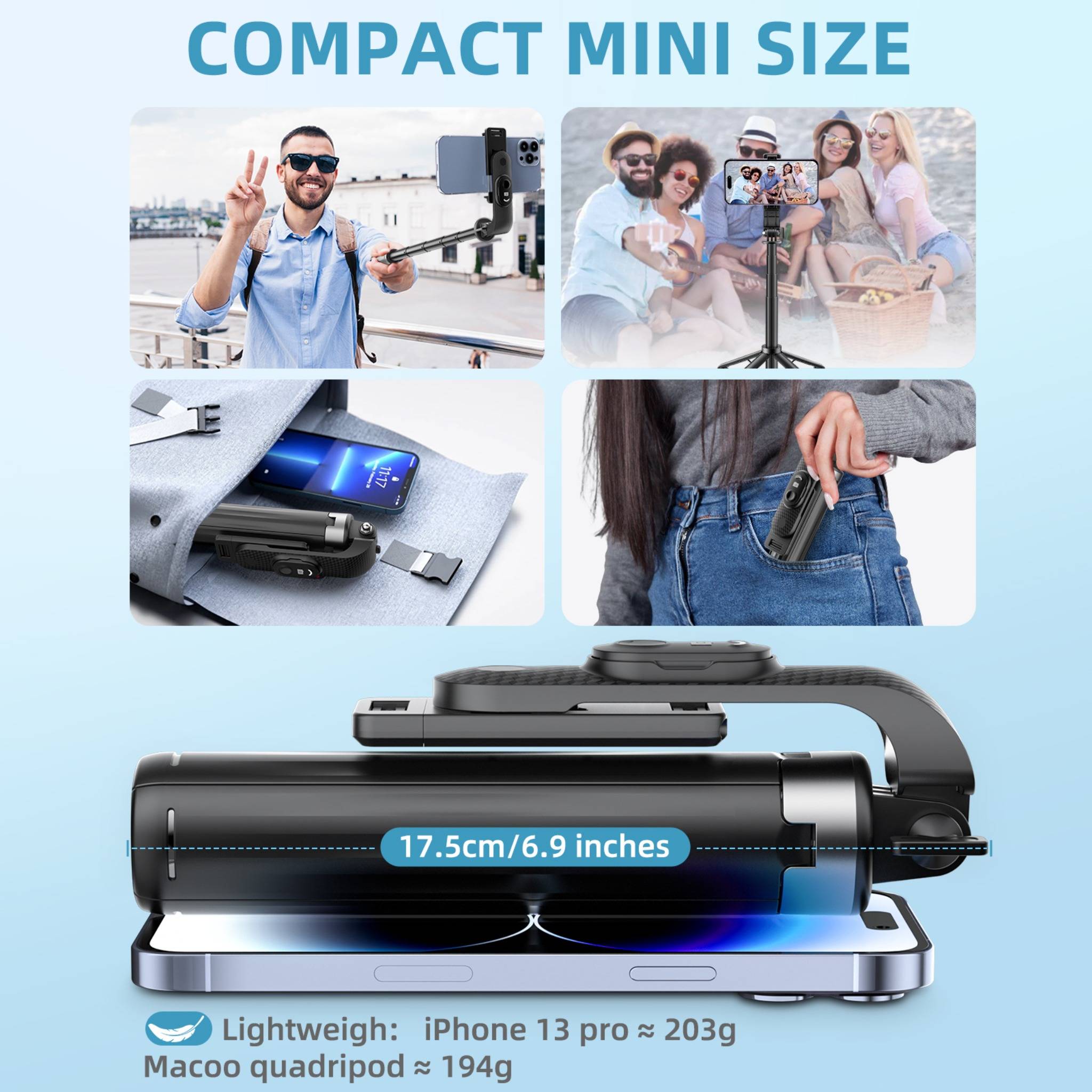 【Stylish Design & Pocket Size】Simple, modern design with a compact and portable build. When folded, the Bluetooth selfie stick measures only 6.9 inches (17.5 cm), making it easy to fit into a backpack or even a pocket. Ideal for travel and everyday use—capture every memorable moment with ease.