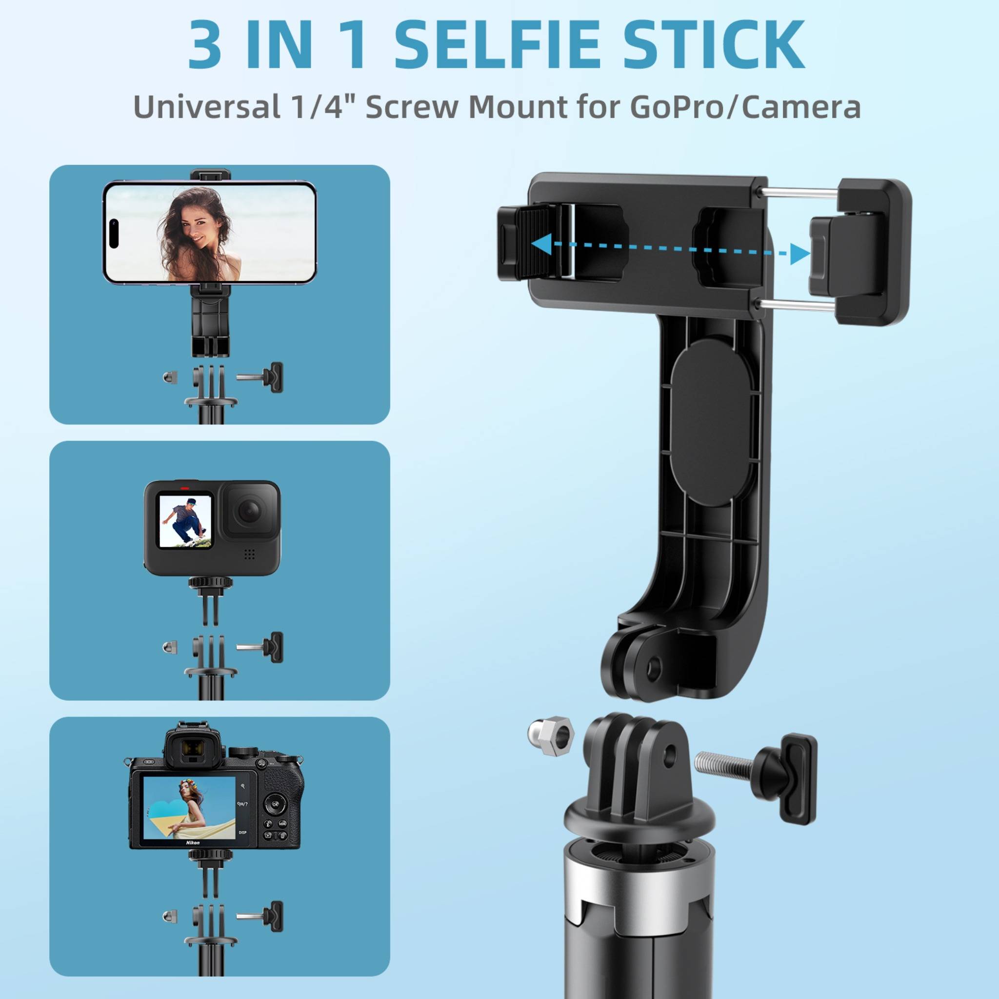 【Latest Multifunctional Selfie Stick】The latest selfie stick tripod with remote control allows you to take photos and videos with excellent stability while keeping your hands free. The newly upgraded quad tripod with interchangeable 1/4″ screw is also compatible with GoPro mounts and camera tripods. Perfect for selfies, group photos, video recording, live streaming and more.