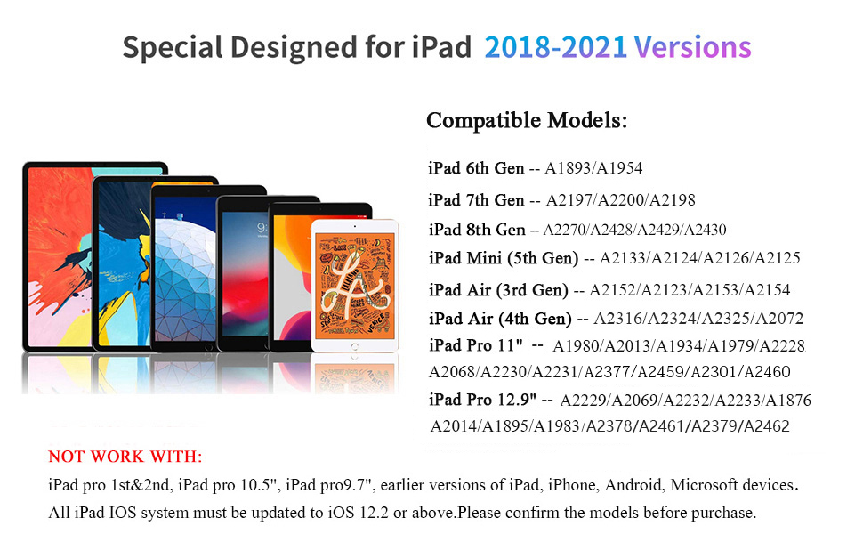 - 【Compatible with 2018-2022 iPad & iPad Pro】The stylus supports for iPad series 2018-2022 model: iPad 9th/8th/7th/6th Gen, iPad Air 3rd/4th/5th Gen, iPad Pro 11 inches,iPad Pro12.9 inches 3rd/4th/5th,iPad Mini 5th/6th Gen. Please confirm your devices before you place an order, another model is invalid.