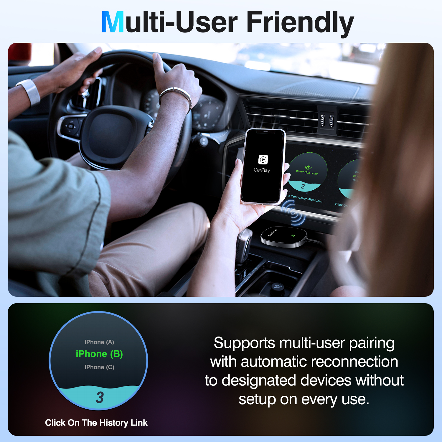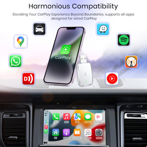- Once paired, the adapter automatically reconnects your iPhone whenever the car starts, making daily use effortless and efficient. Its compact size keeps your dashboard clean, while included USB-A and USB-C adapters ensure compatibility with a wide range of vehicles.